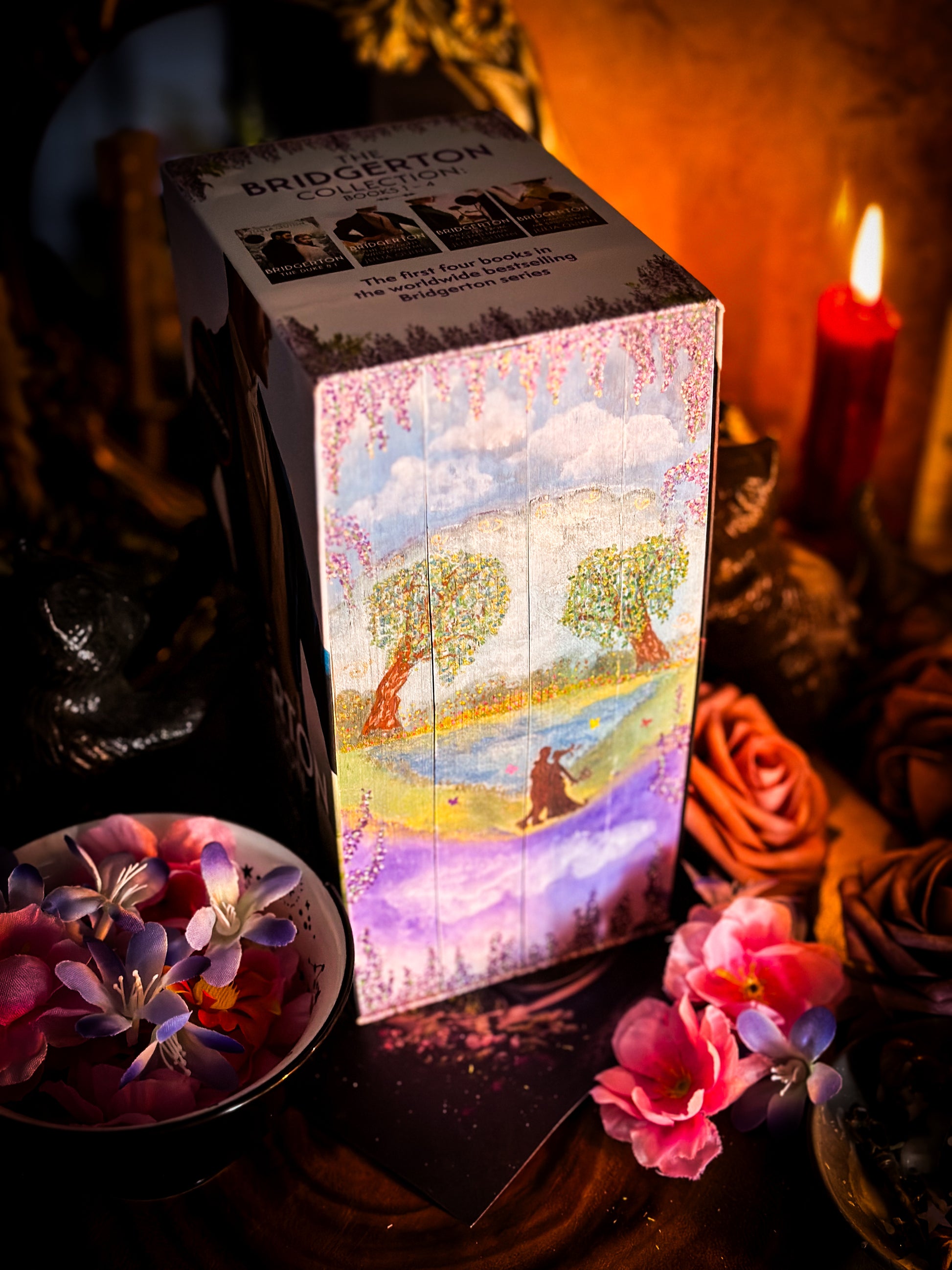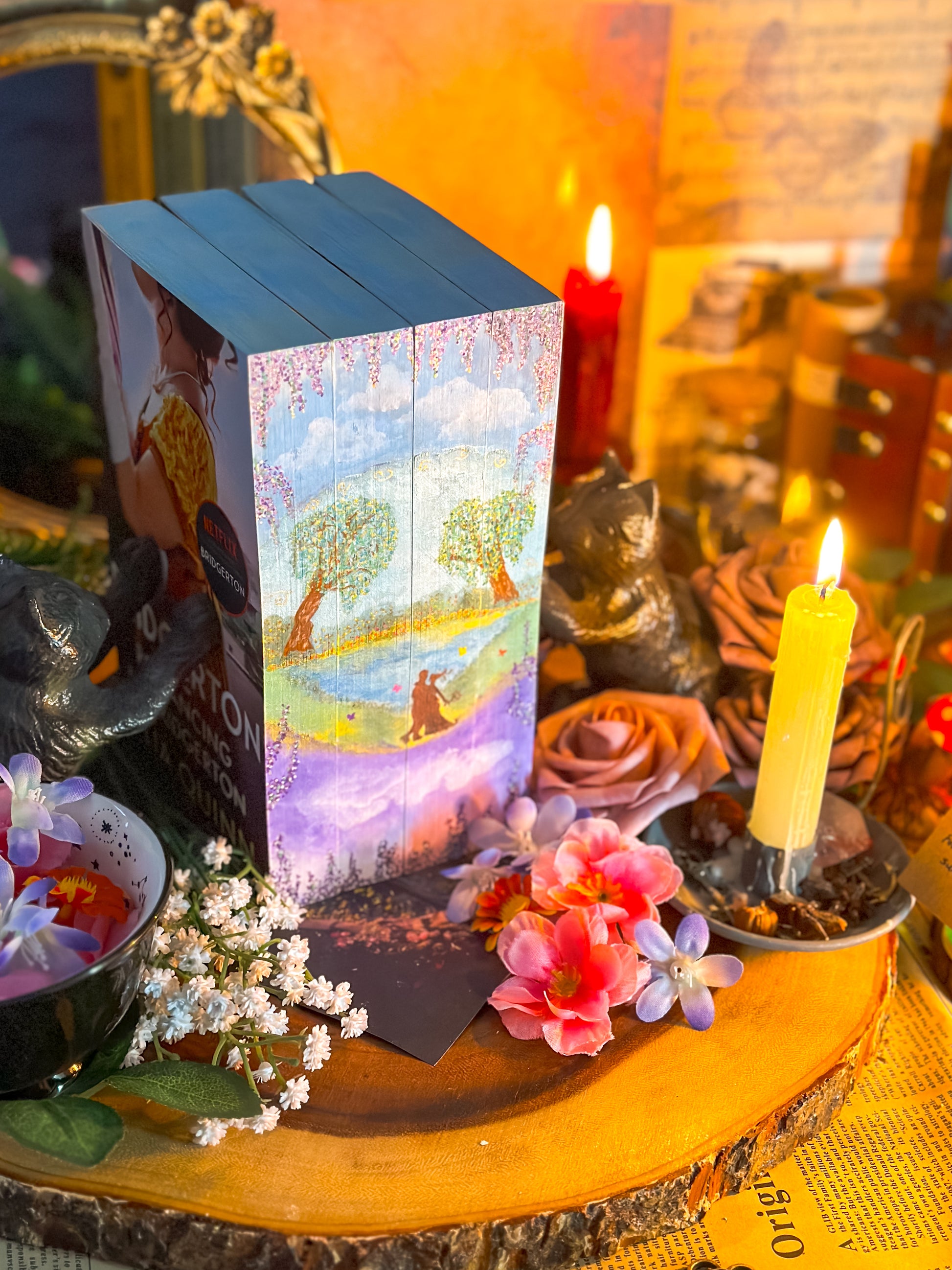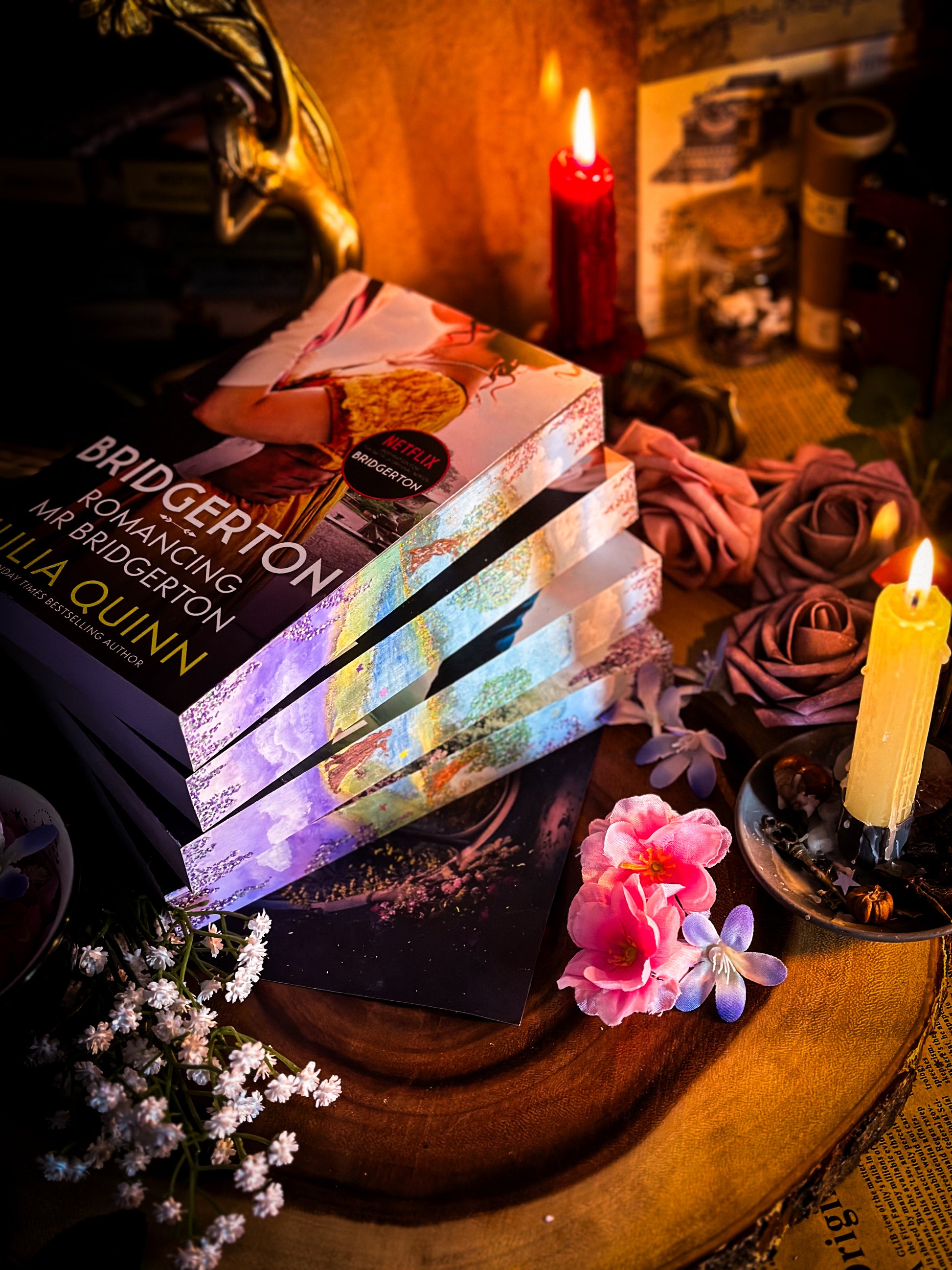 Individually hand-painted book edges of the 1 - 4 books of the Bridgerton series by Julia Quinn